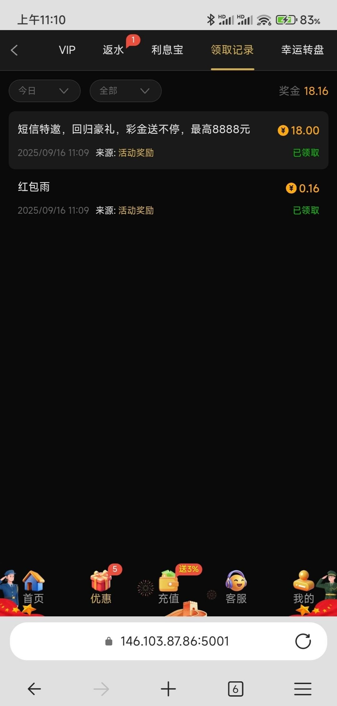 之前是特邀短信自助送9现在又出了一个短信回归之前领过9的估计这个也可以领1238.cc